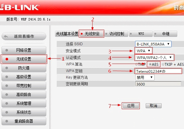 2、无线网络密码设置:点击“无线设置”——>“无线安全”——>“安全模式”选择:WPA——>“认证模式”选择:WPA/WPA2-个人——>“WPA算法”选择:AES——>设置“WAP密码”(无线WiFi密码)——>点击“应用”。